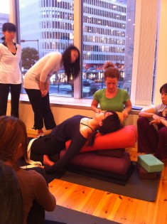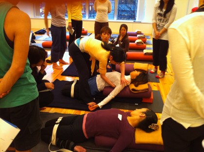 (上)スプタ・ヴィラーサナでのアシスタントのケイコ先生によるアジャストメントデモ。