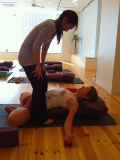 シッティングポーズをSupta(仰向けになって)行いますが、仰向