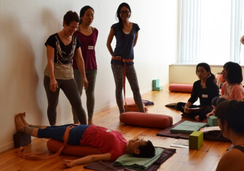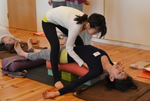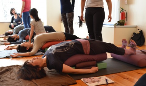 最初のポーズは、Viparita Dandasana 1。心地よいリクライニングポーズをキープするためには、肩の位置が鍵になることは、これまでのワークショップで学んできましたが、実際に「観察力」が格段にアップしたみ皆さんの姿にドミニカ先生もとても感心されてました。