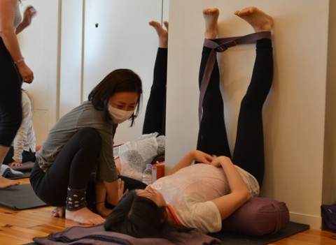 「適応力」についてもこのシリーズで学んできたスキルのひとつですが、たとえば、壁を使ったSetu Bandha Sarvangasanaでは、ブロックとボルスターの距離(位置関係)が大切。ポーズに入る前から出るまでがひとつのポーズだということをリストラティブポーズでは特に意識させられます。