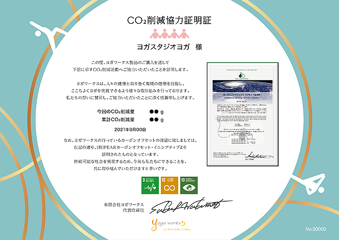 「カーボンオフセット対象」となるヨガマットをご購入いただいた方に証明証を無料発行させていただくサービスです。SDGsの目標でもある「つくる責任・つかう責任」を果たすため、ヨガマットを選ぶ際にも環境問題へ意識を向けていきたいというヨガワークスの想いから実現しました。CO2削減活動に賛同いただいた証として、生徒様へのPRにも活用いただけます。