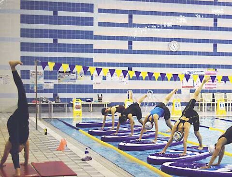 明海大学の屋内プールを舞台に開催されたSUPヨガクラス。台風の日があったにもかかわらず、6日間で12クラスが行われ、大勢の参加者が集まりました。「楽しく、より体幹を鍛えることができる」、「普段のトレーニングとはまったく違う筋肉を使うことができる」といった声が寄せられました。
