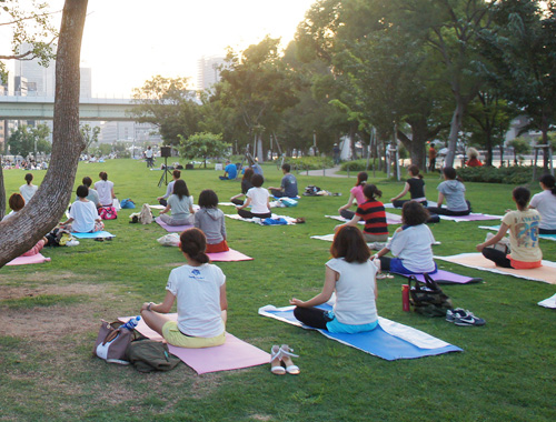 現在「生活ヨガ研究所」のレッスンは主に、教室で行なわれる「インドアヨガ」と、近くの中之島公園での「アウトドアヨガ」に分かれている。アウトドアヨガには2014年の1年間で、イベント含め約4500人もの老若男女が参加した。「社会も自然の一部、生活も自然の一部。全ての根源には先ず繋がりと感謝がありますね」と、珠数先生は話してくれました。