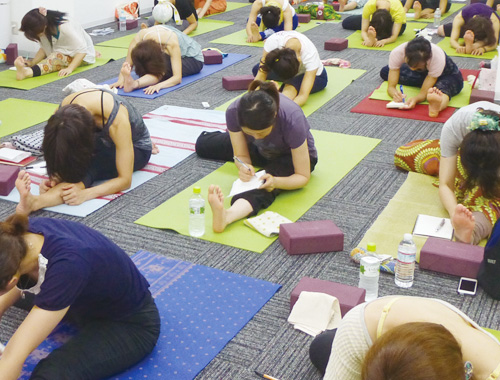 ビクター・チャン先生を招いた陰ヨガWSのひとこま(写真)。ヨガマットにブロック、ヨガベルトなど、プロップスも充実している。