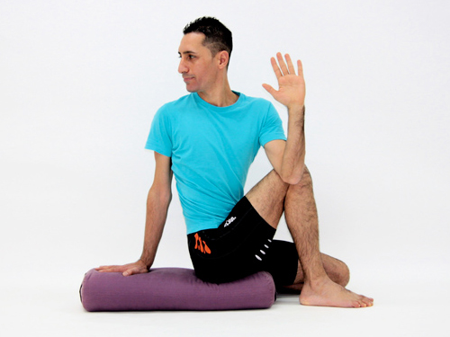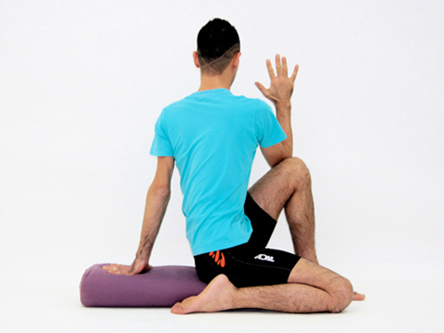 背筋をまっすぐに伸ばし、座骨でボルスターに押すようにします/おなか、肋骨、胸からねじるようにします/楽な呼吸を続けましょう
