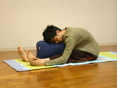 私の場合、ボルスターを使わないと背中が丸まらず真っ直ぐの状態での前屈 となるため、腰の筋肉や筋膜を伸ばすことができません。ボルスターの上で 上半身を完全に脱力させて陰ヨガ的にくつろぐと、意識したい部分に負荷 をかけることができるので、心地よくてよく行います。