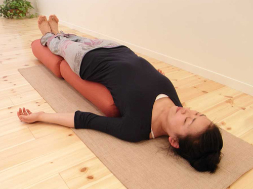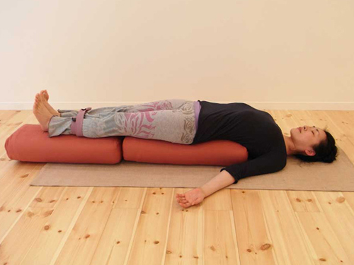 ヨガマットを敷いたうえにボルスター(ひとつまたは2つ)を置きます。ボルスターに座った状態から肩甲骨の下角辺りがボルスターの上部の角にあたるように仰向けになり、胸が充分開いた状態で両肩がマットにおりるようにします。