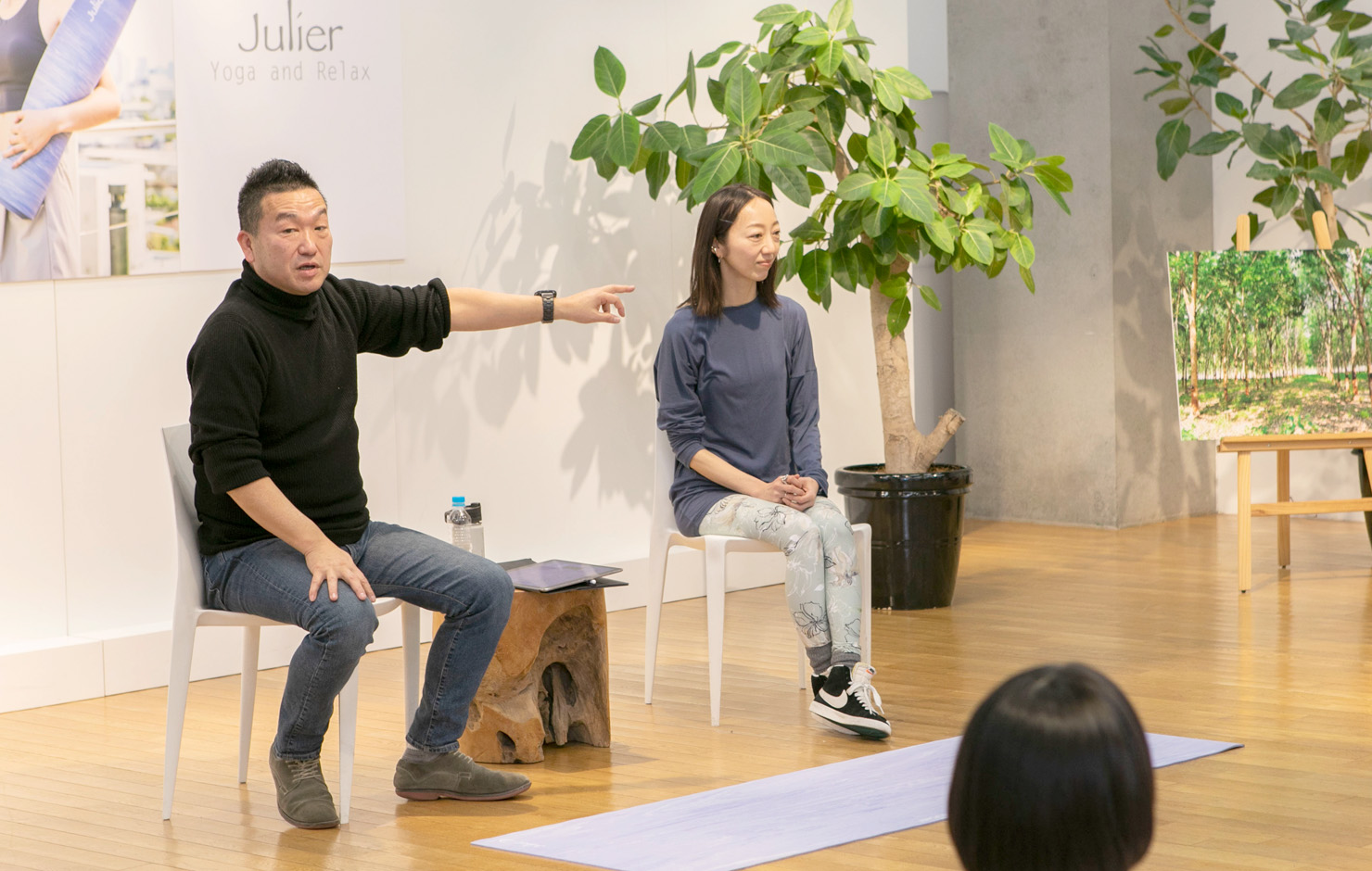 まずはヨガワークス代表の綿本と、julierディレクターの吉岡史織さんのクロストークからスタート。