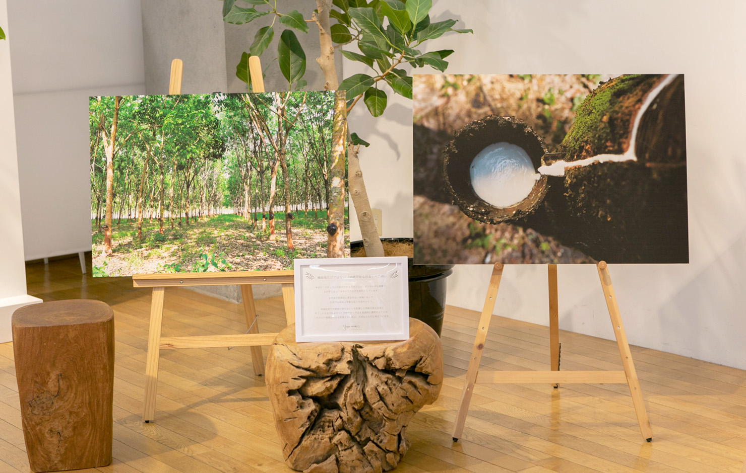 会場にはゴムの林や、その樹から実際にゴムが採取されている様子の写真が展示されており、本当に自然から生まれたヨガマットだということを実感しました。