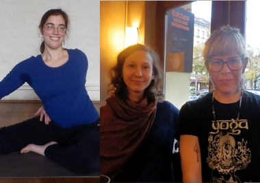 <写真>(左)インストラクターのジュリーさん(Julie Blumenthal)はニューヨークから移住してきた。ヴィンヤサヨガクラスを英語で担当している。キルタンシンガーでもある。(右)イエローヨガのオーナーの1人、クラウディアさん(Claudia Dietrich、左)。心理学者でもありパフォーマンス教育プログラム スマッシュ・ベルリン にも携わる。インストラクターのヴィクトリアさん(Victoria Larsson、右)はスェーデン出身。ベルリンでは数少ない陰ヨガインストラクターだ。小説家でもある。