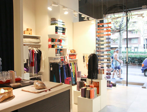 サグラダアファミリアのほど近く、南西に10分ほど歩いたサン・ジョアン通りにあるガラス張りの外観。ガラス越しに覗くヨガスタジオYOGAIAは、カラフルなヨガマットやラグが並ぶモダンな空間だ。ショップの奥にある受付カウンターでチェックインして、置きマットが並ぶ更衣室を通り過ぎると、150平米のヨガスタジオが現れる。スタジオ内には、窓がない代わりに奥手に4畳間ほどのガラス張りの四角い庭があつらえられていて、光を集めたグリーンがガラス越しに鮮やかに映えている。