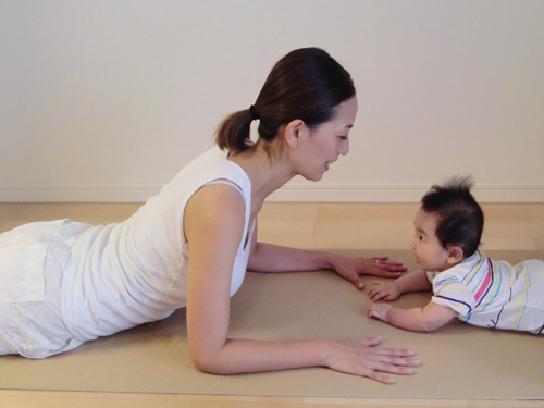 ベイビーを腹這いにして、お互いの顔を突き合わせましょう。ママンの顔が上下に動くことでベイビーが喜び、同じ動きを真似することも。